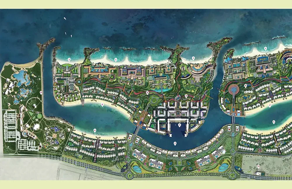 Mina Al Arab stretches along the Ras Al Khaimah coastline and is described as comprising six districts and two man-made islands.