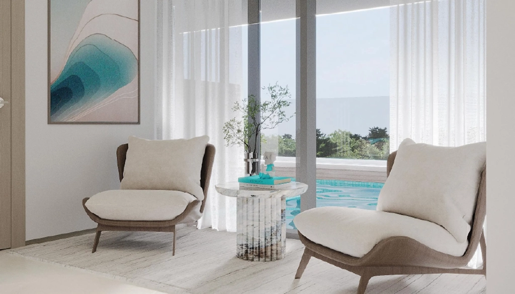 Architecturally, the façade reads as a deliberate composition of form, light, and materiality. The building rises as G+2P+8, a detail which respects the low-rise cadence of a quality island enclave. It still establishes expansive views from multiple vista points. Large glazed areas and well-proportioned volumes allow the interiors to breathe and draw in natural light. A minimal approach to facade details and clean lines provide a modern coastal style that responds to the surroundings. Encompassing spaces which form part of REEF 997 Residences, the façade is calibrated to form leisure design, winter gardens, and sunken balconies that are both private and generous at the same time. The circulation strategy places well-defined, approachable public spaces that set a refined tone of arrival to homecoming.